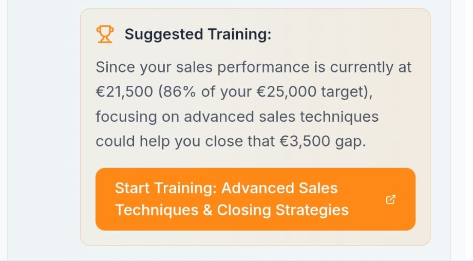 Spre deosebire de dashboard-urile tradiționale de raportare, PerformIQ este un strat de execuție. Nu doar măsoară performanța, ci permite acțiuni imediate prin prompturi de coaching, clasamente dinamice și micro-traininguri bazate pe AI.