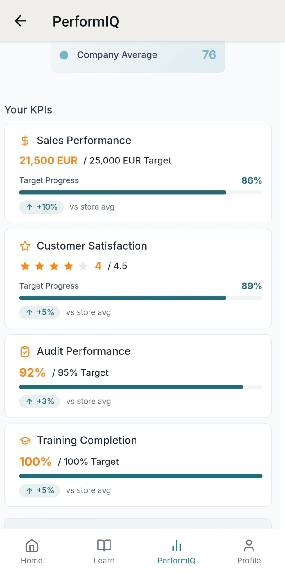 PerformIQ conectează comportamentele frontline—precum recomandările de produse sau calitatea serviciului—la rezultate măsurabile. Prin scoaterea acestor insight-uri la suprafață în timp real, platforma ajută la creșterea vânzărilor, îmbunătățirea experienței clienților, a engagementului angajaților și a consistenței operaționale între locații.